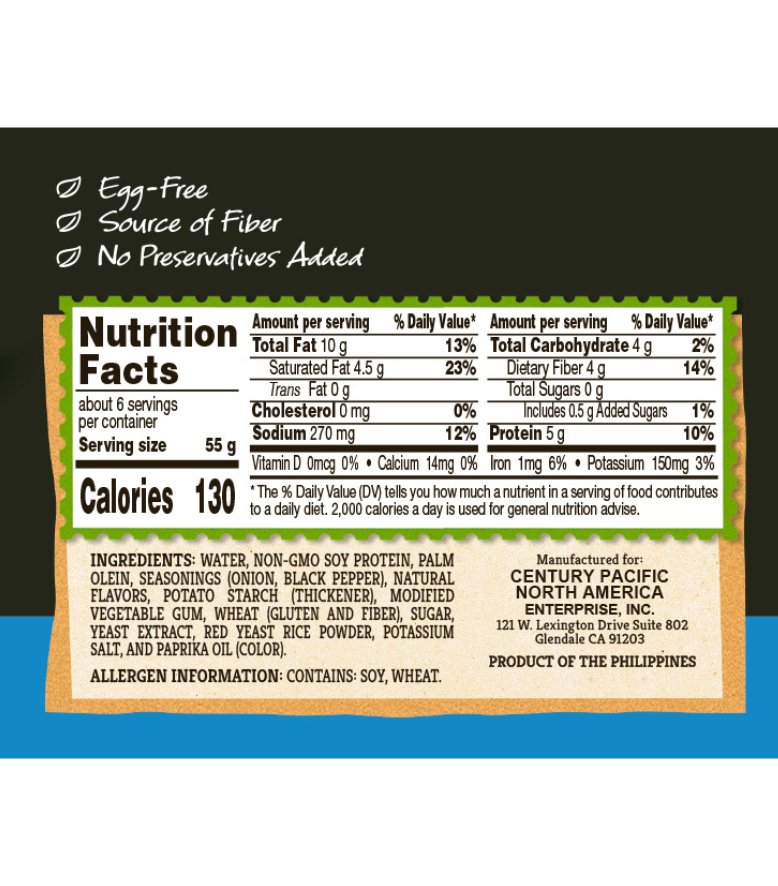 Water, Non-GMO Soy Protein, Palm Olein, Seasonings (Onion, Black Pepper), Natural Flavors, Potato Starch (Thickener), Modified Vegetable Gum, Wheat (gluten and fiber, Sugar, Yeast Extract, Vinegar, Potassium Salt and Paprika Oil (color)