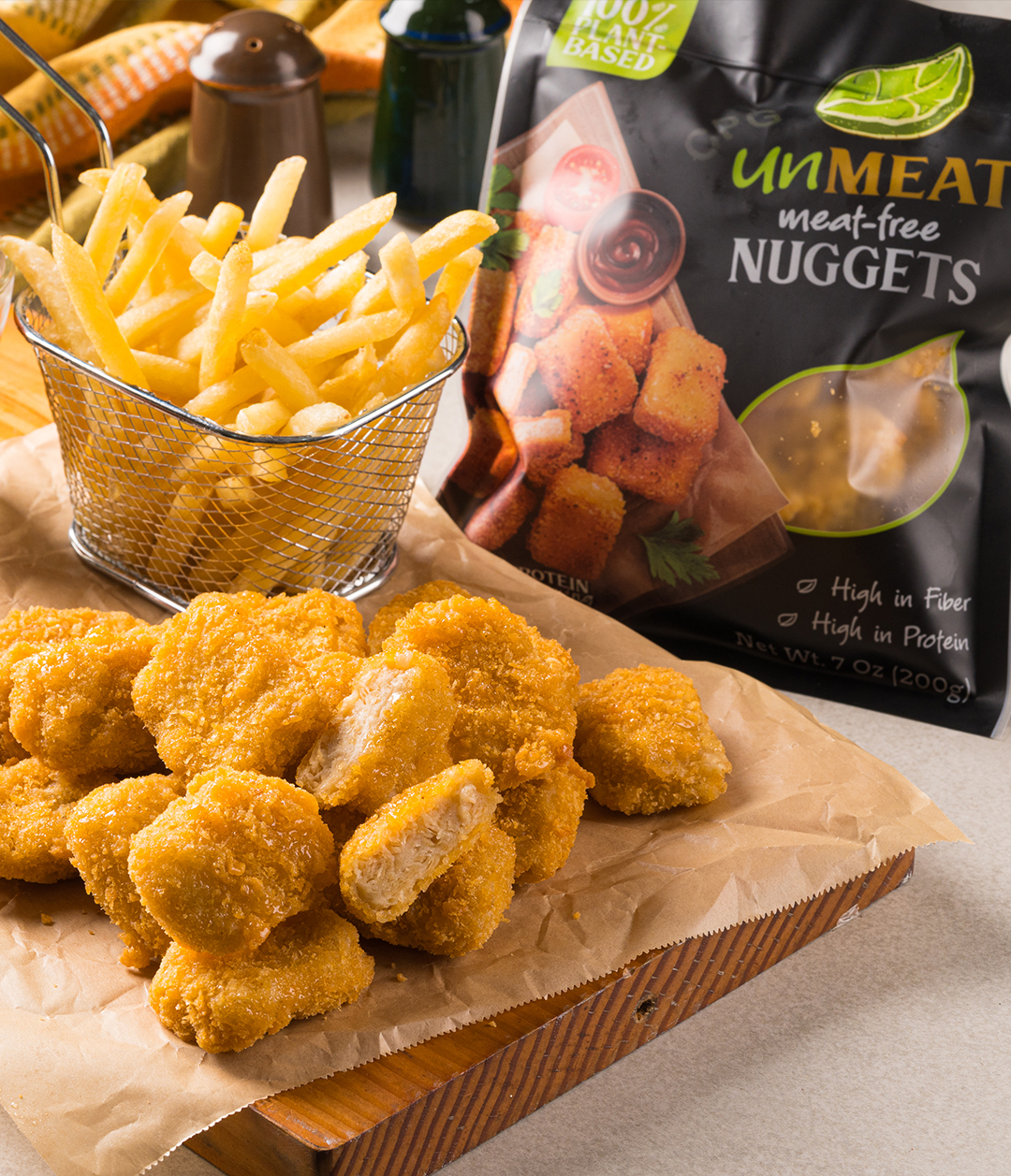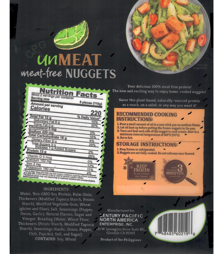 unMEAT Nuggets are great for a quick fix for your snacking needs. Perfect for both kids and kids at heart with its juicy texture and rich meaty flavor. It's high in protein and fiber to keep you and the kids healthy! This non-GMO product is 100% plant-based, so you don't have to worry about trans-fat and cholesterol with each bite.