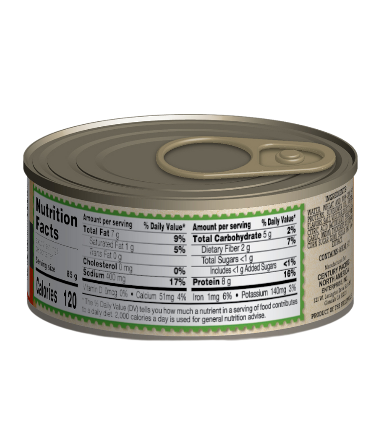 Water, Wheat and Non-GMO Soy Proteins, Sunflower Oil, Natural Flavors, Salt, Vegetable Broth, Chili, Citric Acid (Acidulant), Seasonings, Thickeners (Cornstarch, Xanthan Gum), Sugar, and Yeast Extract